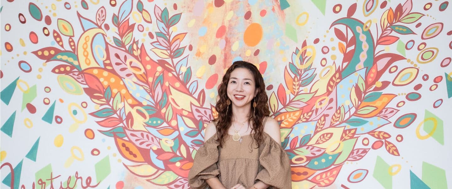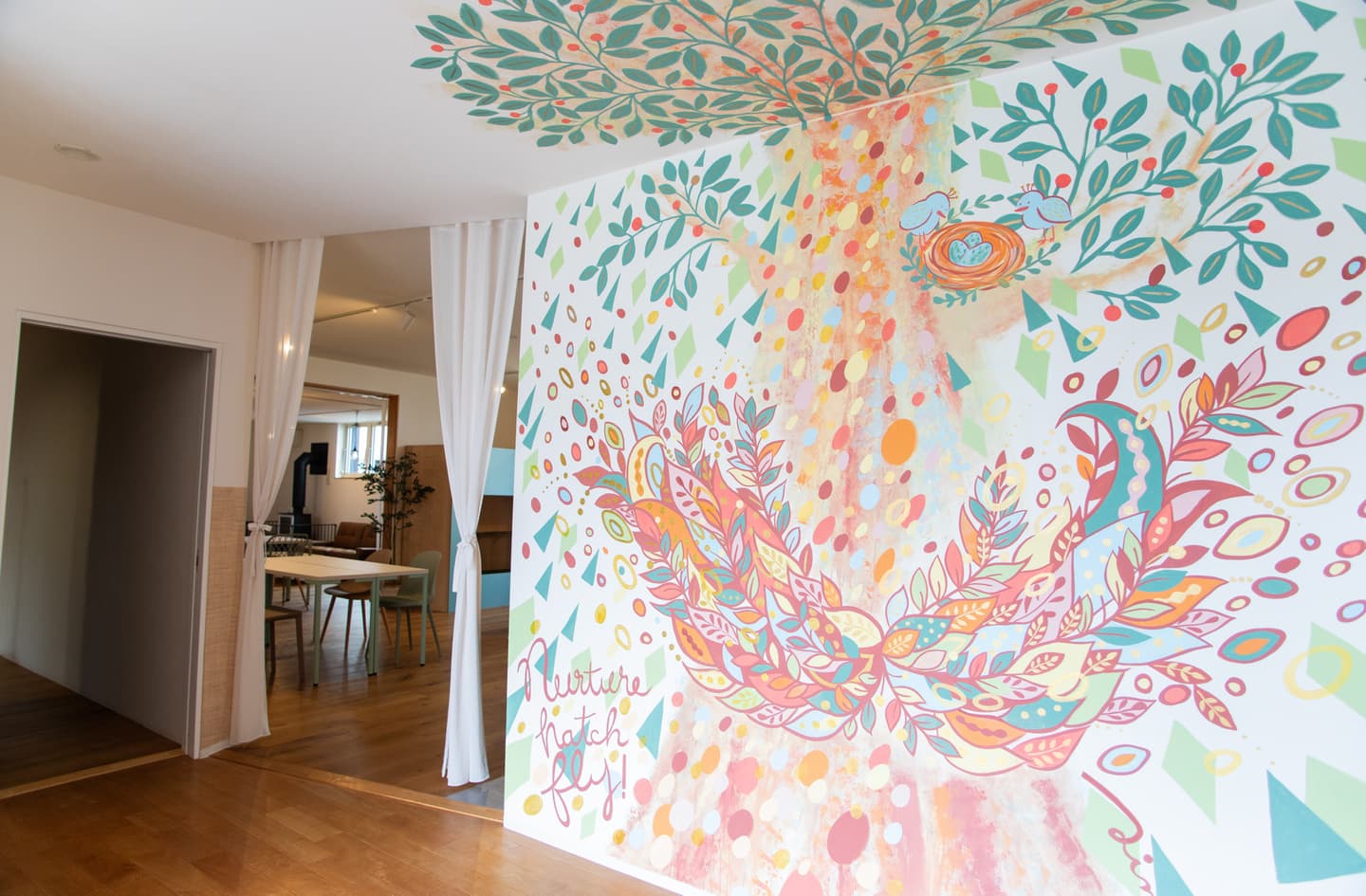 エントランスに入ってすぐに、アーティストのAi Mikiさんによる圧巻の壁画。羽の前に立って写真を撮ると、羽が生えているように見えます。