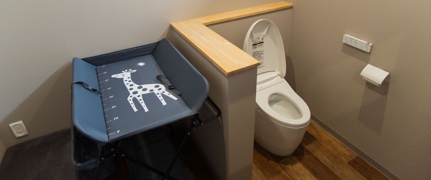 お手洗いは3箇所あります。1箇所には、オムツ替え台と授乳できるベンチもあります。
